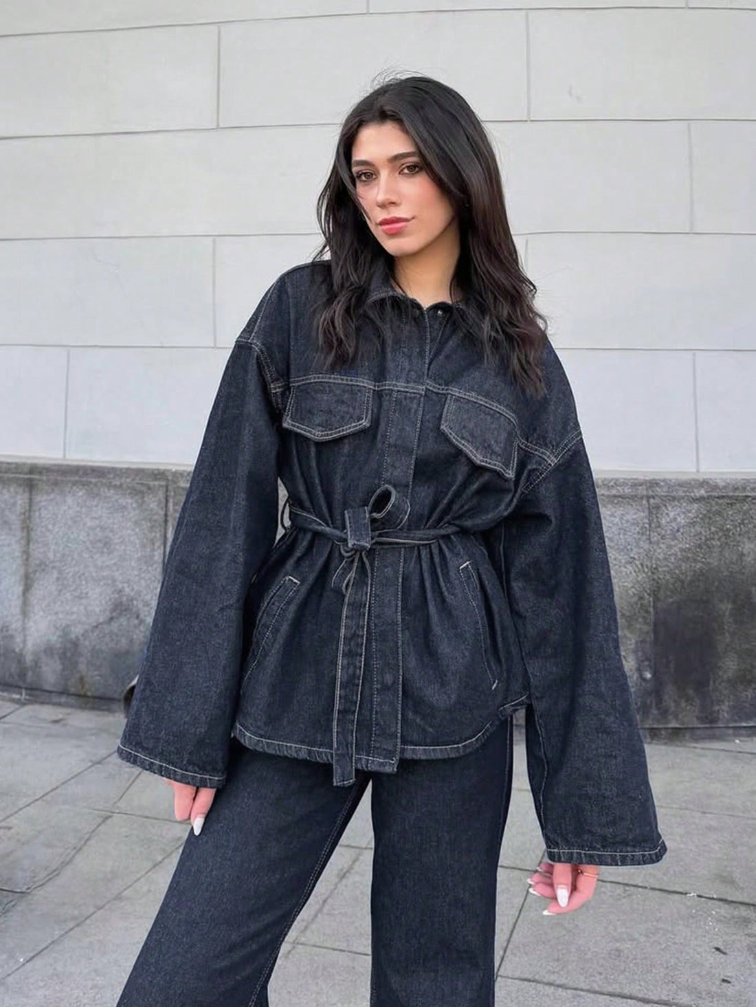Embrace timeless style with the Lexie Belted Denim Jacket. This classic navy piece offers a...