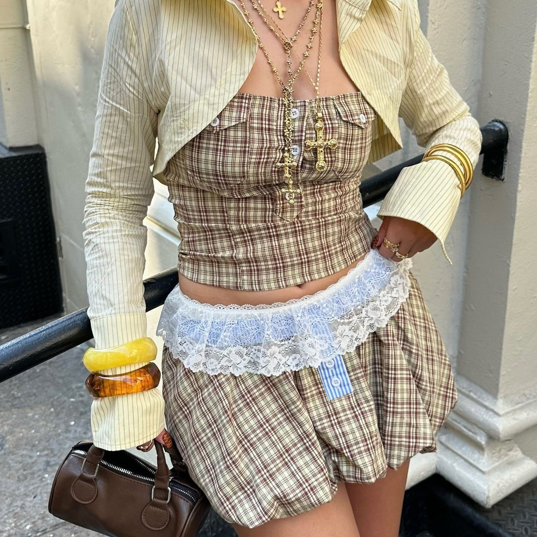 This charming plaid skirt adds a vintage-inspired touch to your wardrobe. With its bubble hem...