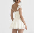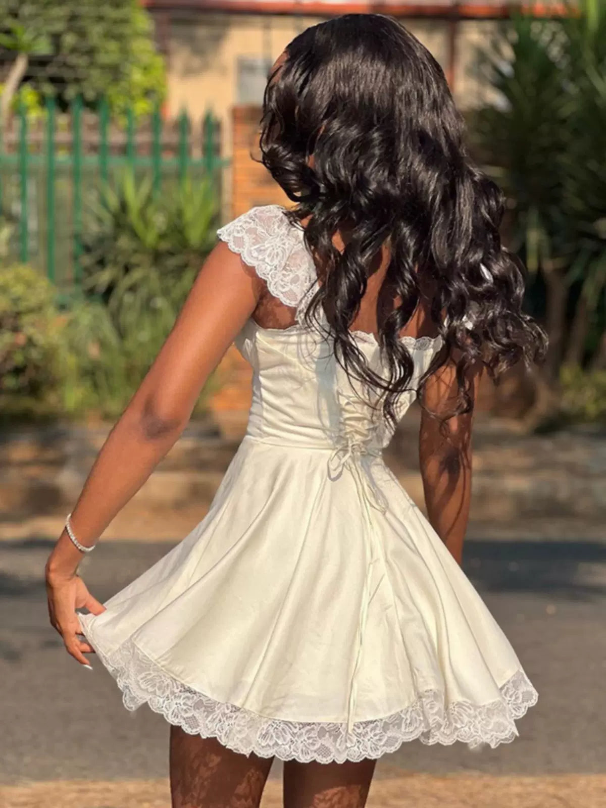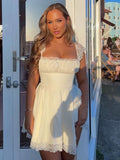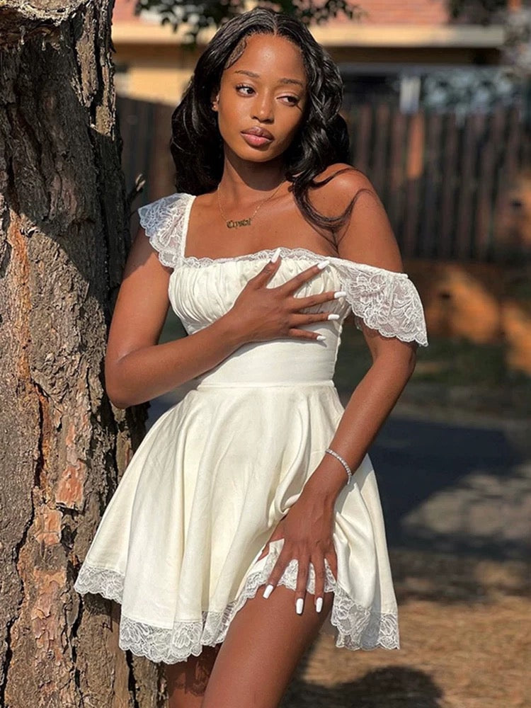 Embrace effortless elegance with the Avalena Lace Trim Mini Dress. Designed in a pristine white hue, this dress features romantic lace detailing on the sleeves and hemline. The ruched bodice offers a flattering, feminine fit, while the flared skirt adds playful charm. Perfect for garden parties, bridal showers, or a dreamy date night.