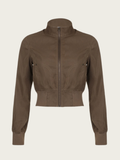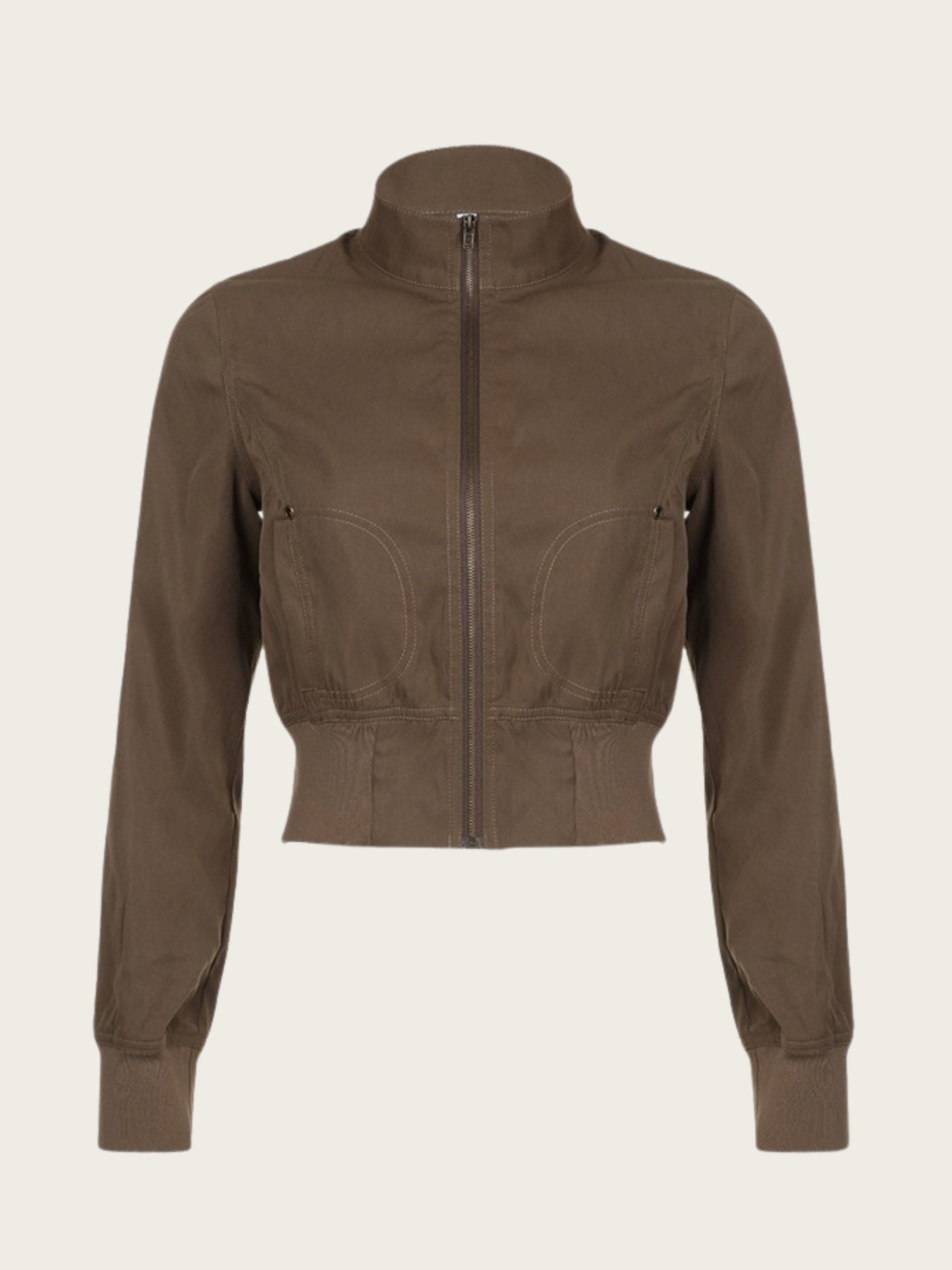 Embrace an effortlessly cool vibe with the Ayleen Cropped Utility Jacket. This stylish outerwear piece, presented in a rich brown hue, redefines everyday chic with its contemporary design. Featuring a sharp stand collar and a prominent full-zip front, it's crafted to offer a refined yet edgy silhouette. The jacket’s subtly cinched waist and functional flap pockets add both structure and practicality, making it a versatile addition to any fashion-forward wardrobe. Pairs perfectly with high-waisted denim or cargo pants for a complete, street-ready ensemble.