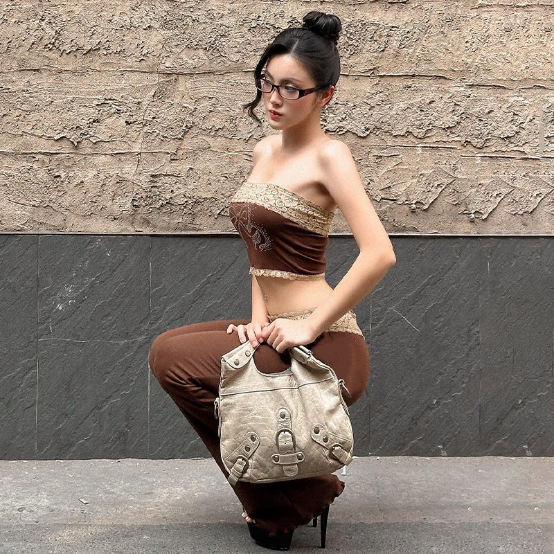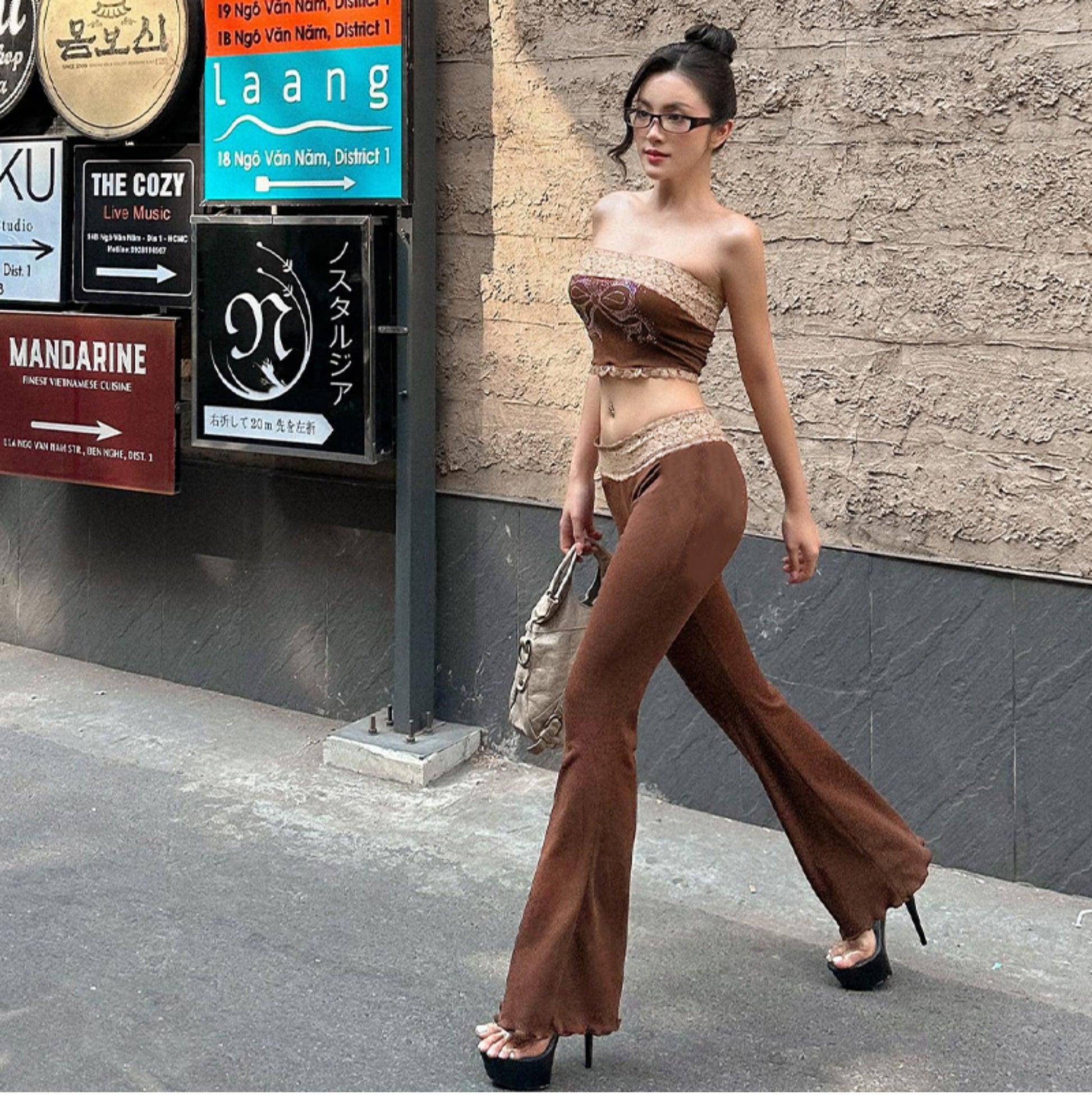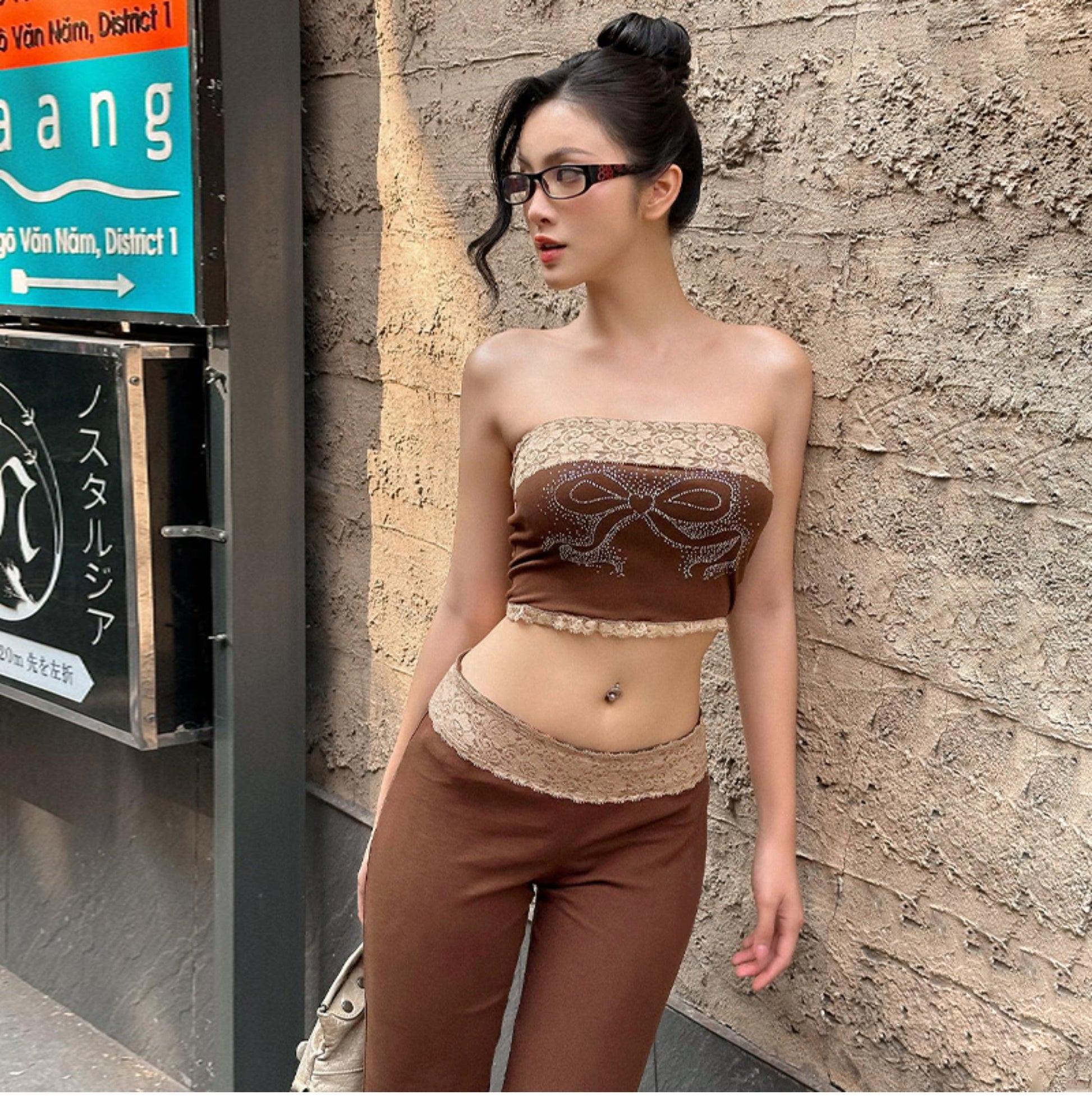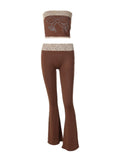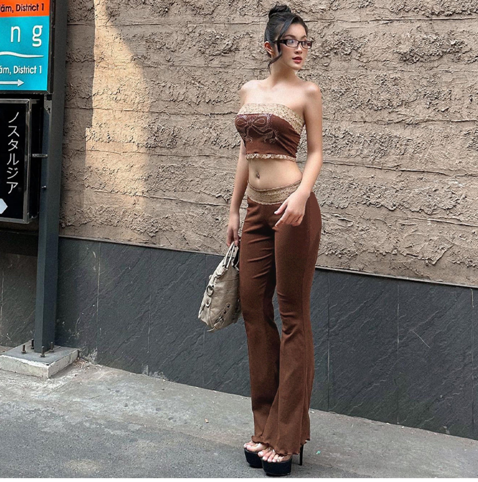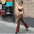 Unleash your inner fashionista with the Elva Lace Detailed Pants Set! This stylish and sexy set includes a strapless tube top and high waist flare pants with a crystal embellished bow design. Perfect for a casual day out or a hot date, from LaPose's Hot Girl Suit Collection. Brown never looked so good!