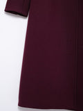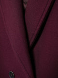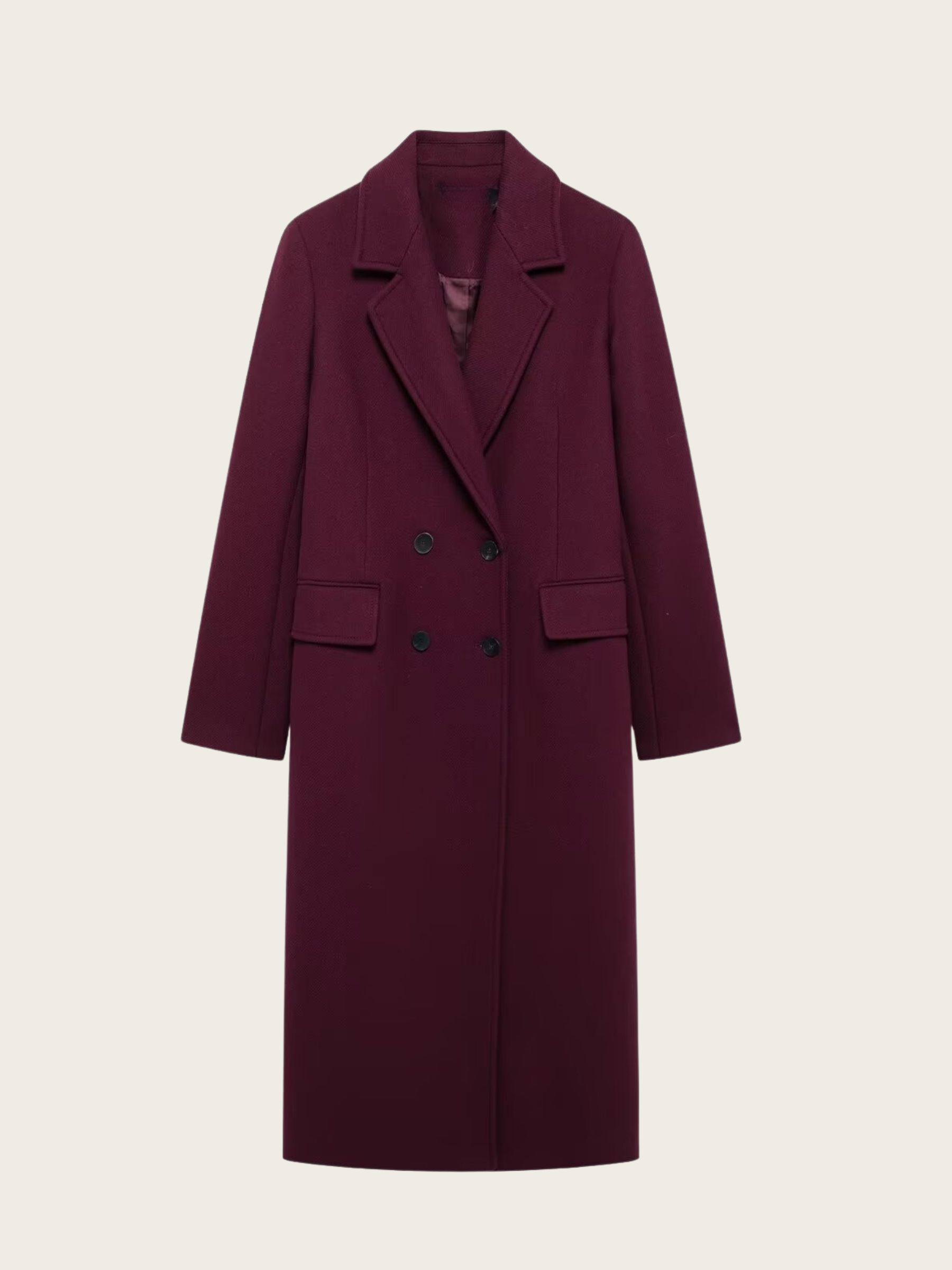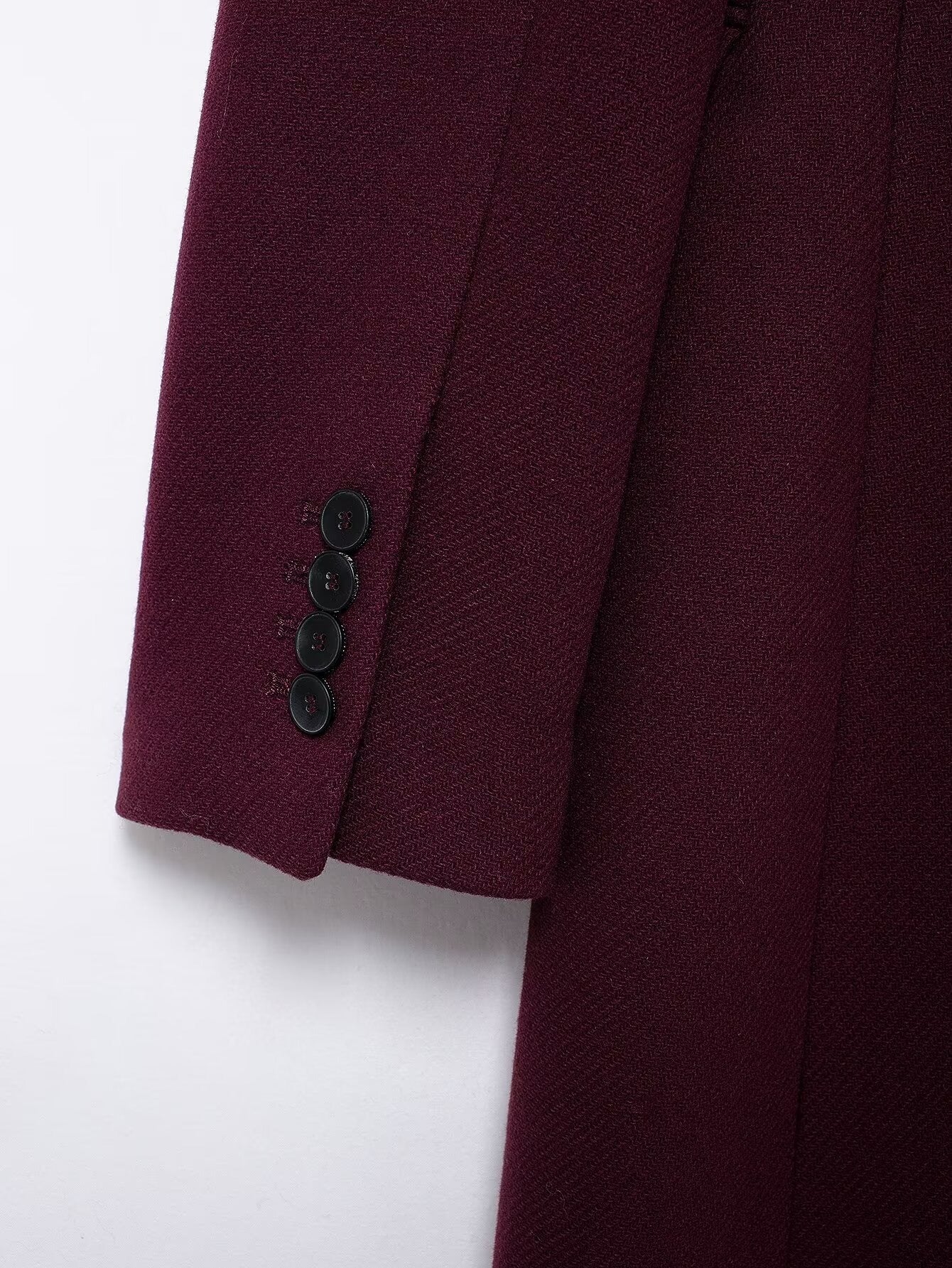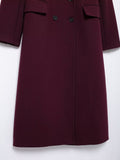 Discover timeless elegance with the Heavenleigh Wine Red Long Coat. This sophisticated outerwear piece captivates with its rich wine red hue and classic silhouette, perfect for making a statement. Featuring a distinguished double-breasted front and a cinched belted waist, it offers a refined look that transitions effortlessly from day to evening.