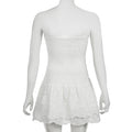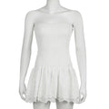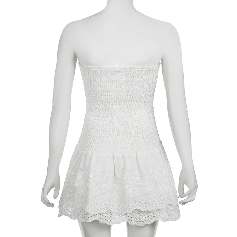 Get ready to turn heads in the Jae Strapless Mini Dress in White! This sleeveless dress features a low waist and A-line skirt for a flattering fit. The lace-trimmed design adds a touch of elegance to this playful piece from the LaPose Mini Dresses Collection. Perfect for any occasion, this dress is a must-have in your wardrobe.
