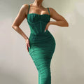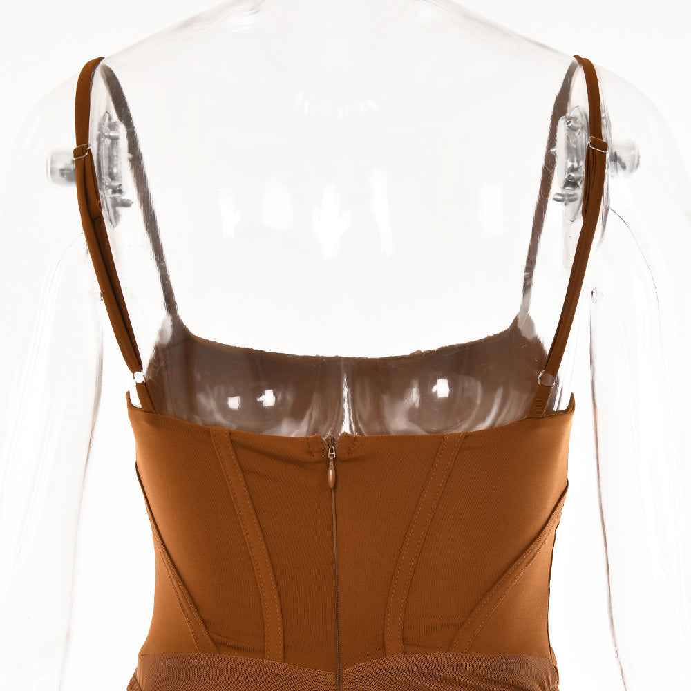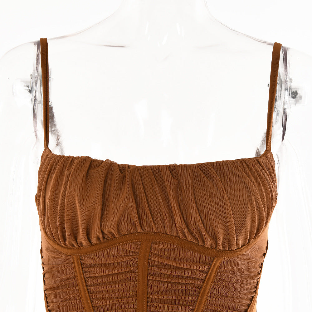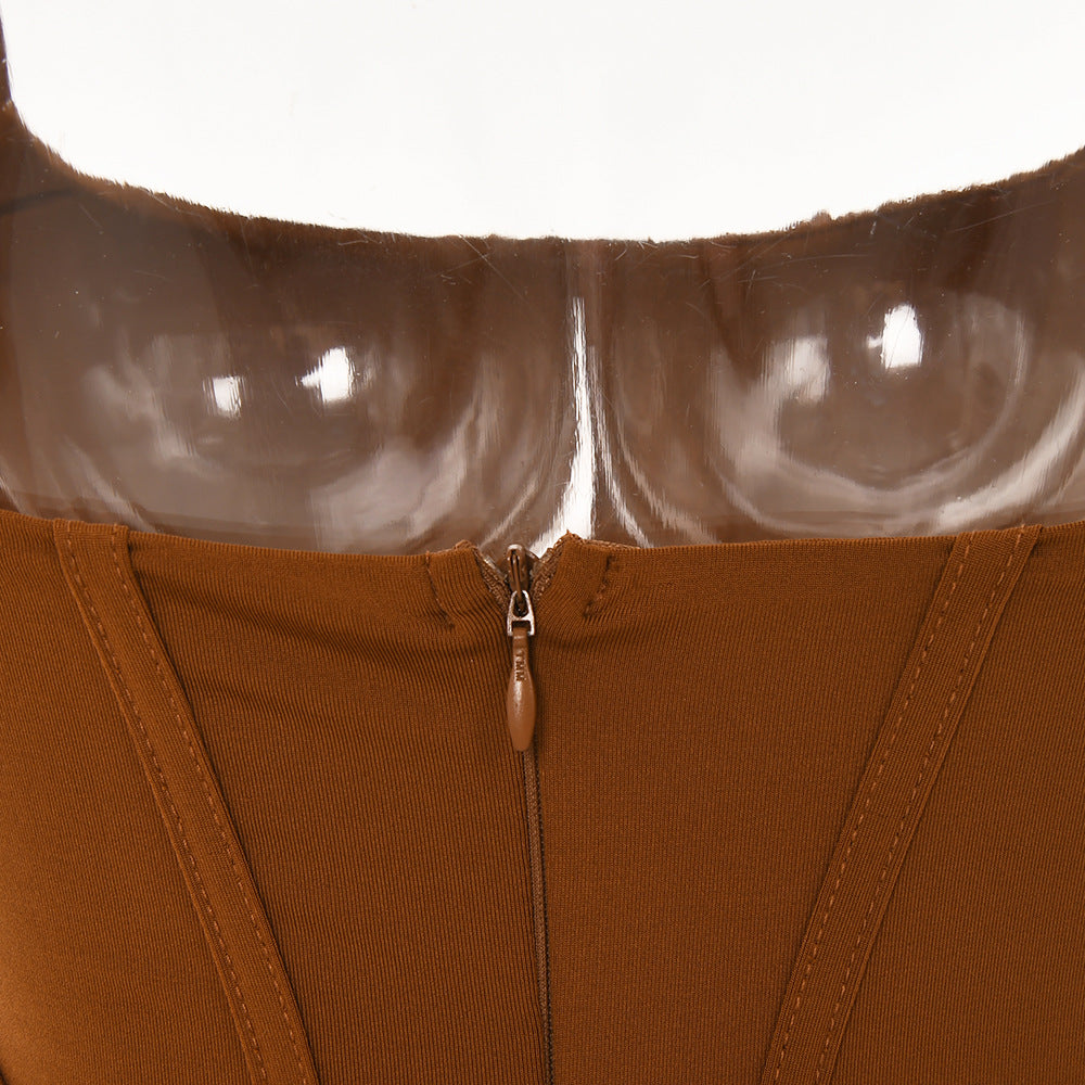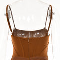 Turn heads with the Juliette Ruched Corset Midi Dress. This striking piece features a structured corset design for an hourglass silhouette, while the ruched detailing adds texture and dimension. Perfect for evening soirees, date nights, or formal events, its rich brown tone exudes sophistication.