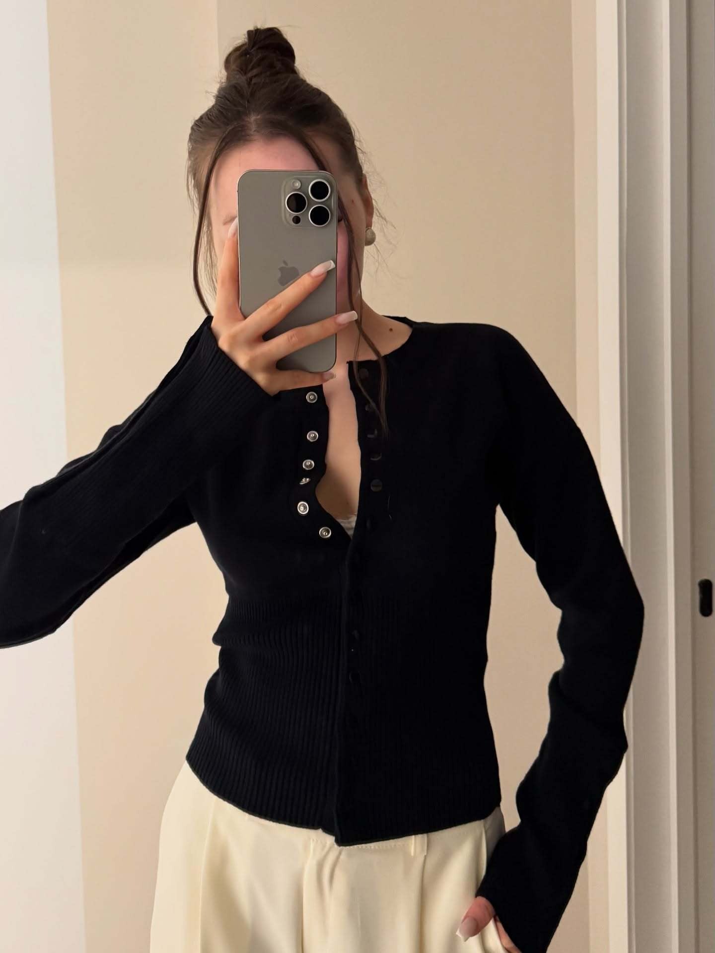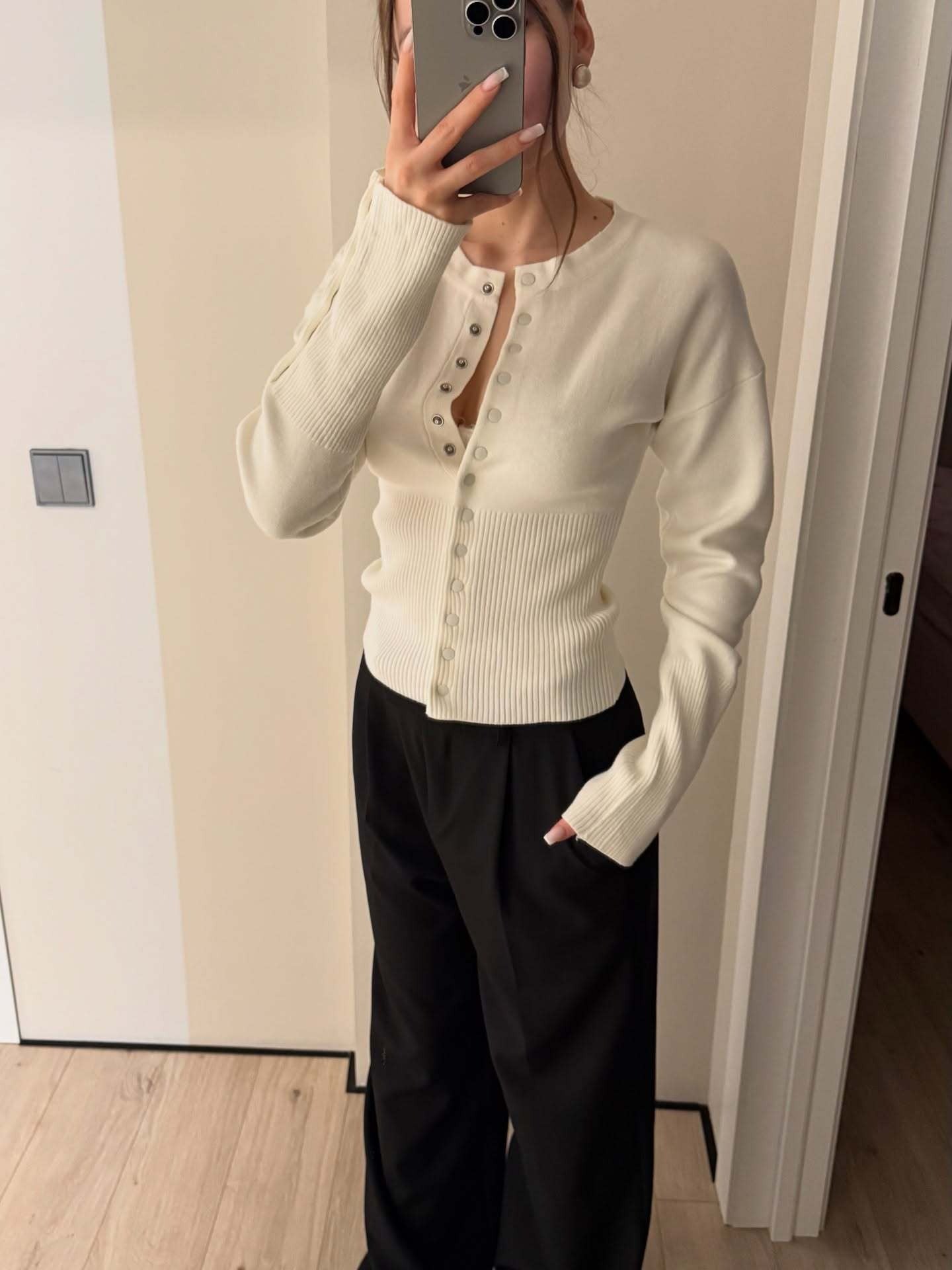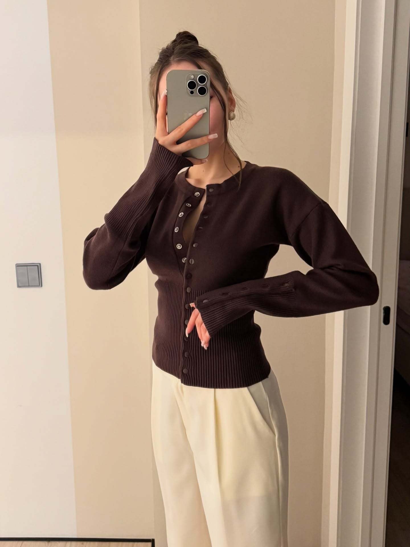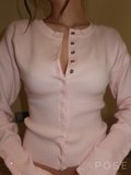 A feminine and versatile knit cardigan designed to shape the silhouette with its ribbed body and adjustable snap-front detail. The soft blush tone and elongated cuffs with matching button accents bring a romantic yet modern aesthetic, making it an ideal piece for effortless everyday styling or elevated looks.