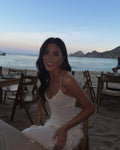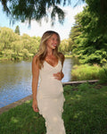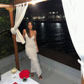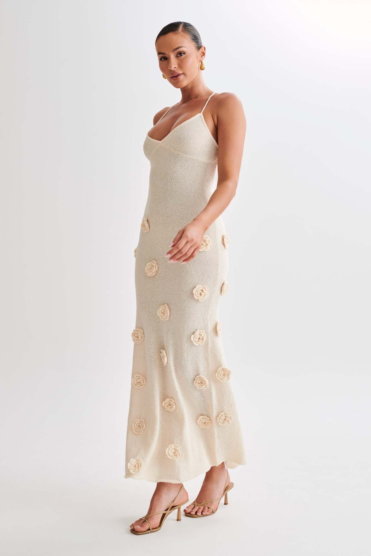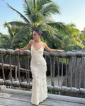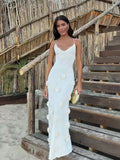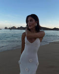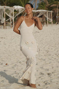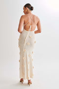 Natalie Floral Embellished Maxi Dress is a breathtaking white dress featuring delicate 3D floral appliqués, adding a romantic and whimsical touch. Crafted from a shimmering, textured fabric, this dress offers a flattering body-hugging silhouette with a V-neckline and slim spaghetti straps. Perfect for special occasions, vacations, or sunset beach dinners, this dress will have you turning heads with every step.