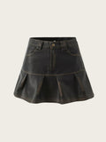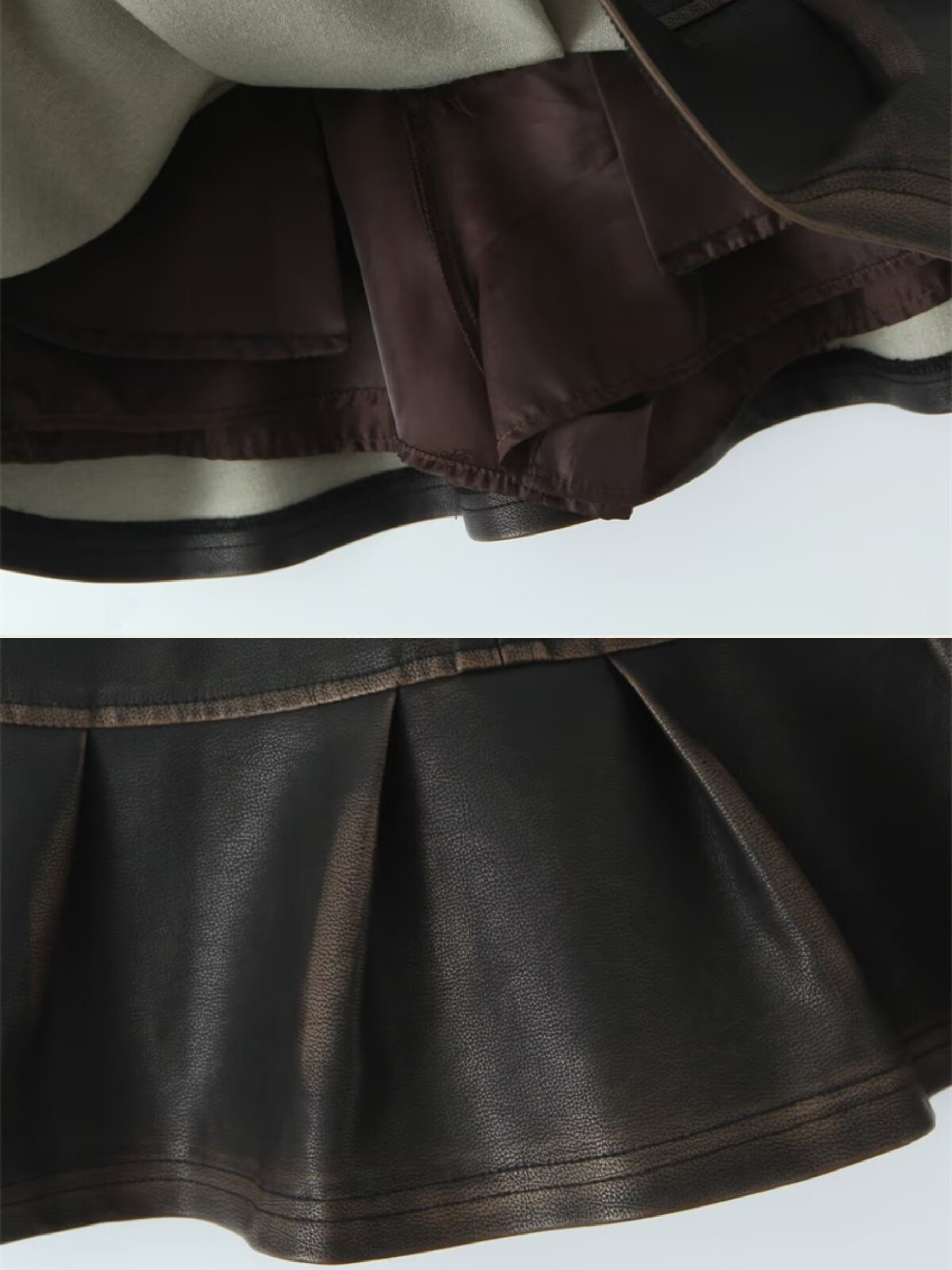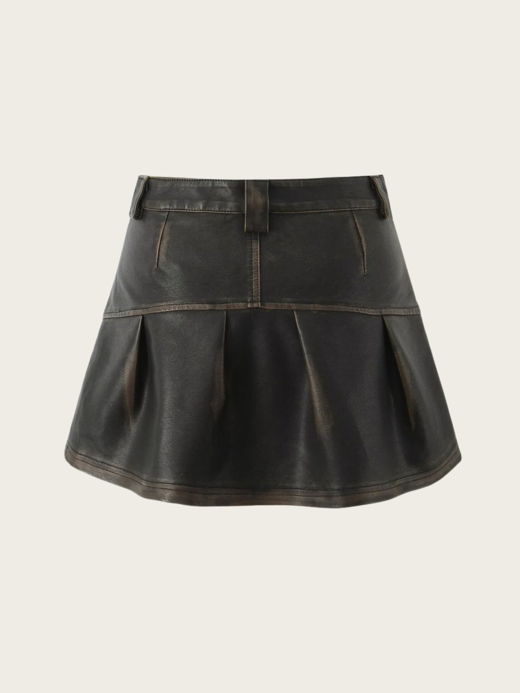 Introducing the Renna Vintage Faux Leather Skirt, a bold take on classic style with a contemporary twist. Crafted from high-quality faux leather with a distressed finish, this mini skirt features pleated details that add a chic touch to its edgy vibe. The fitted waistband with belt loops and front button closure ensures a flattering fit, while the flared silhouette enhances the feminine appeal. Perfect for adding a daring edge to your casual outfits or for a night out look.